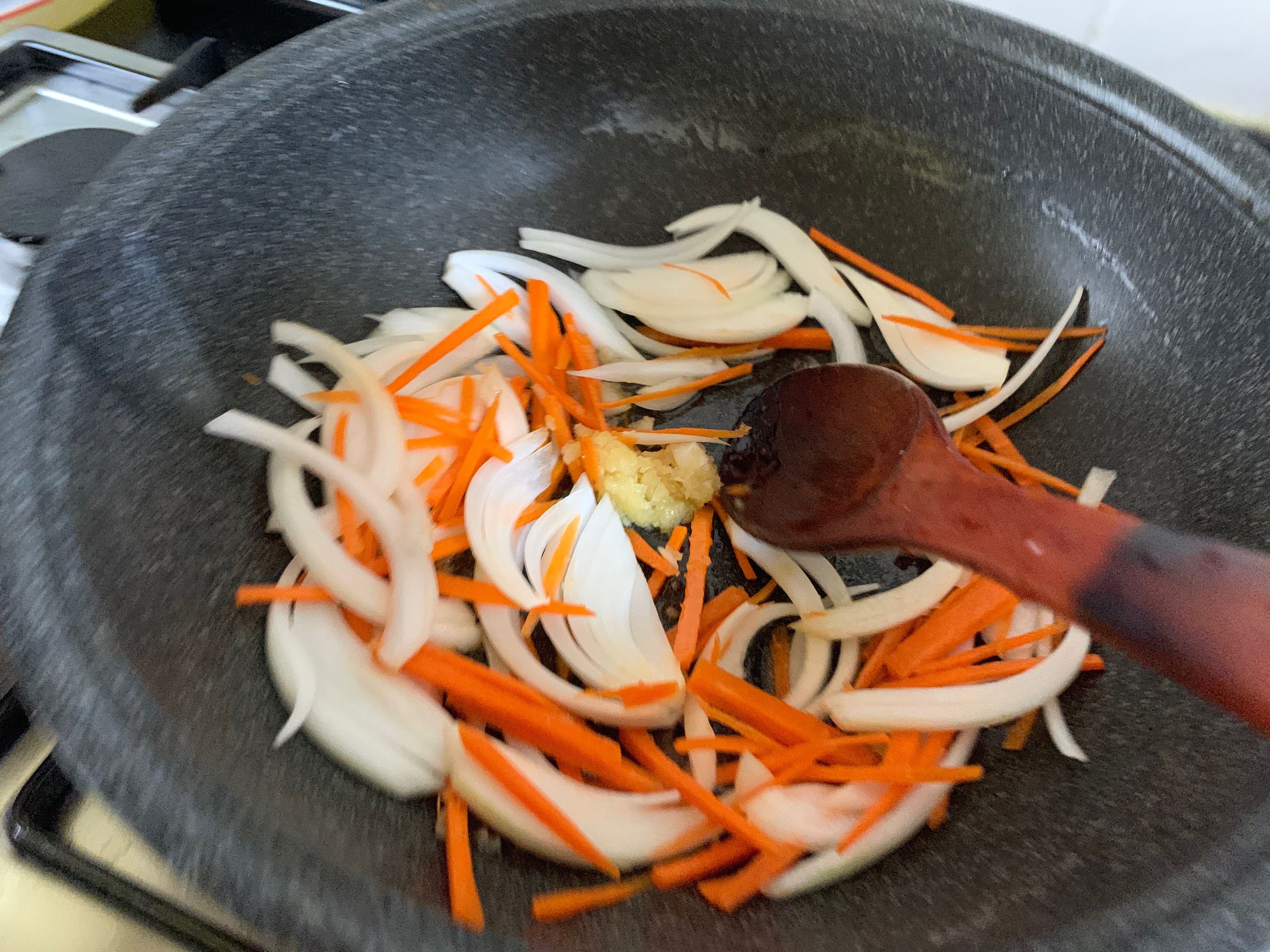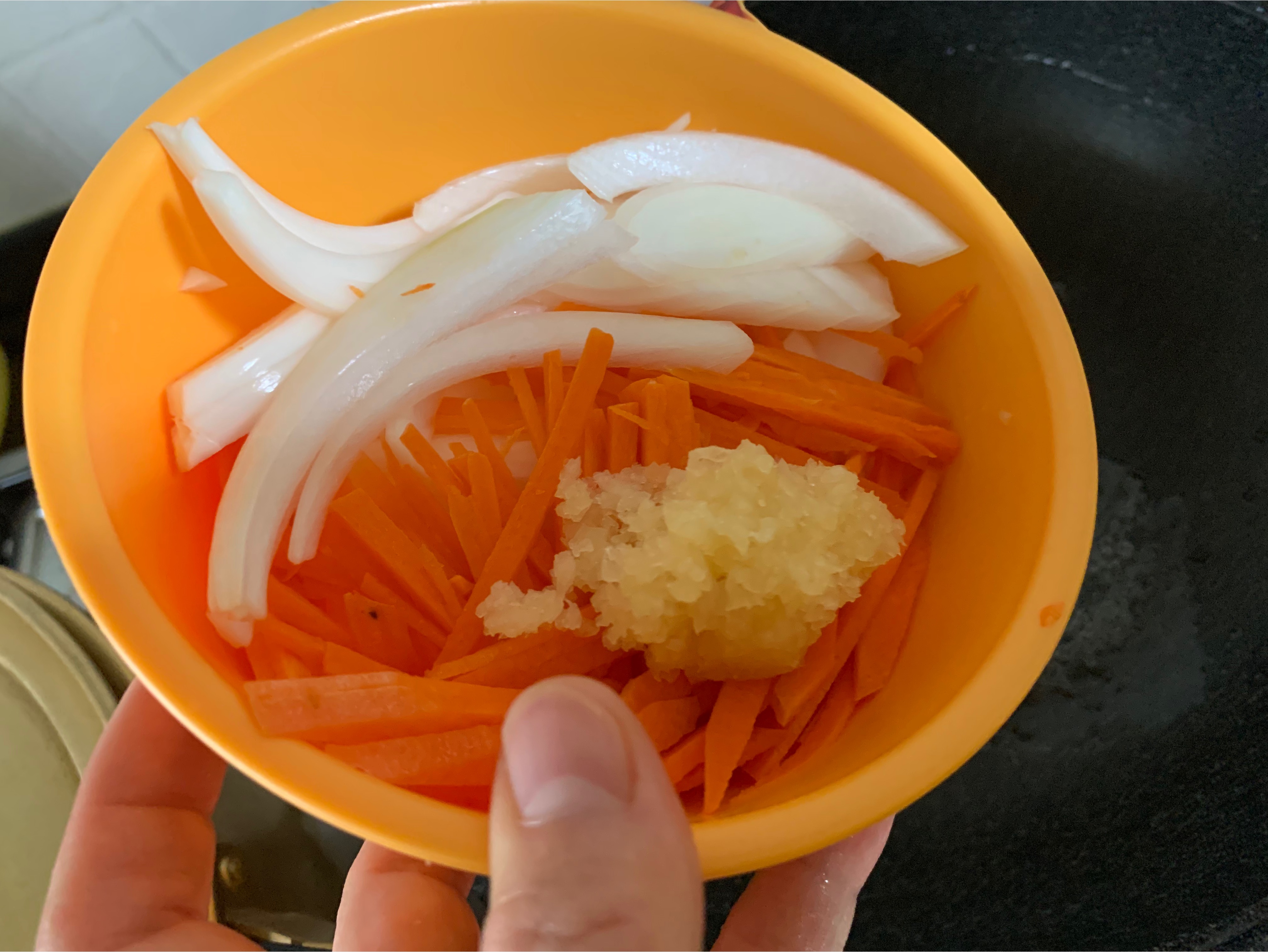 미역줄기만 볶아도 맛있지만 채썬 양파,당근 준비했어요. 마늘도 인간답게 팍팍